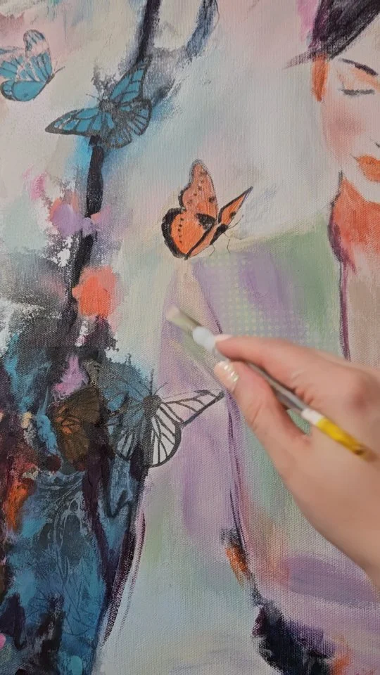 I paint tender feminine figures, resting cats, and the gentle rhythms of gardens and shorelines, often touched by wings, flowers, and fleeting creatures. Through luminous colors and serene expressions, I seek to capture the feeling of safety, serenity, and surrendered bliss.”